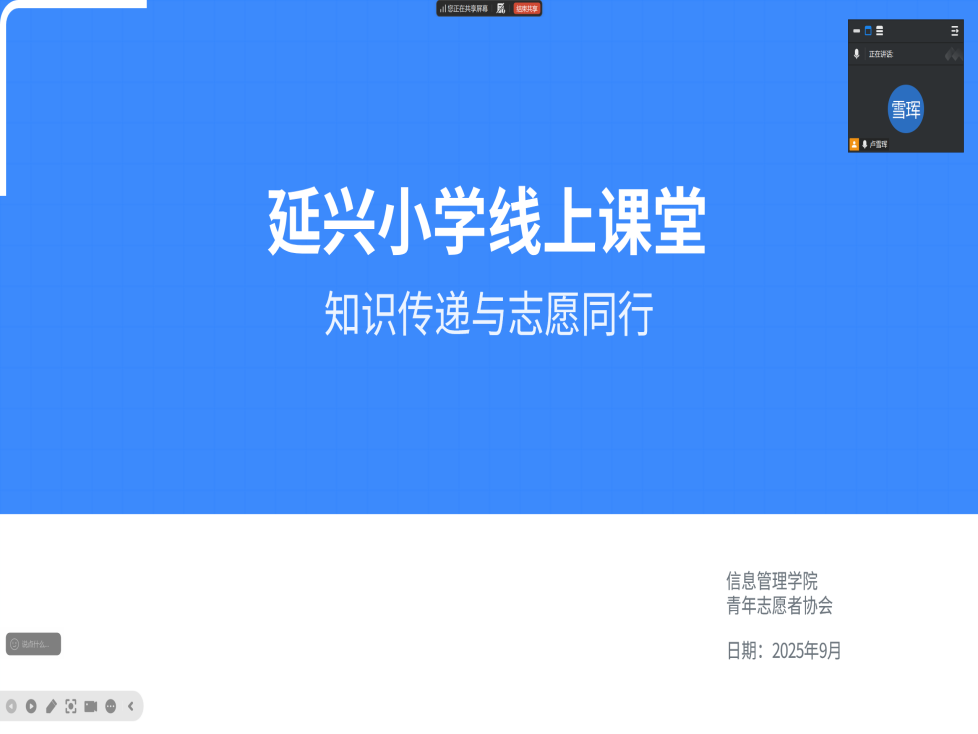 信息管理学院青年志愿者协会组织骨干志愿者于2025年9月24日为延兴小学的同学们打造了一系列内容丰富、形式生动的线上课程,用专业与热忱书写着新时代青年的责任与担当。