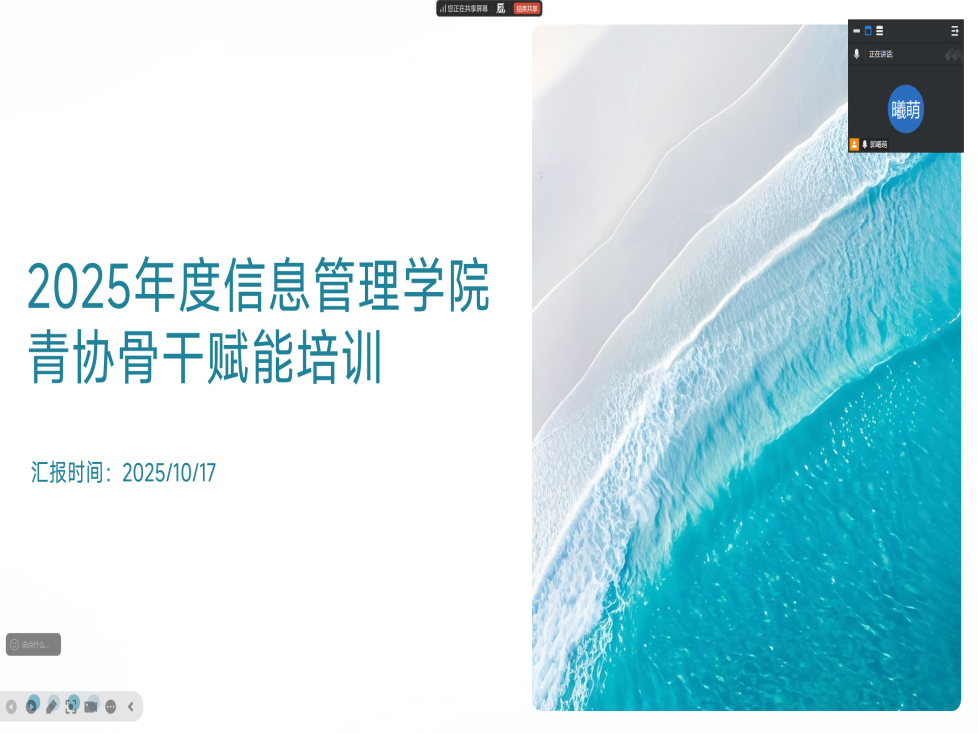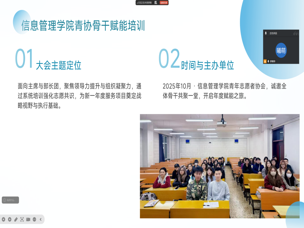为全面提升青年志愿者骨干的综合素养与实务能力,学院于2025年10月17日正式召开2025年度青年志愿者协会骨干培训会。本次培训特邀学院团委副书记、2024级思想政治辅导员郭曦萌担任主讲人,信管青协主席团及部长团全体成员参会。