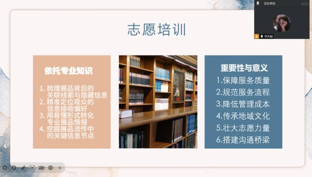 会议伊始,李天赫围绕“微课宣讲方法”与“志愿服务流程”两大核心,为志愿者进行系统培训。在微课宣讲方面,她重点讲解了如何将情报学、图书情报等专业知识与展陈内容相融合,指导志愿者从“挖掘红色资源的历史传承价值”和“探索专业服务的时代路径”两个维度构建内容,提升思政微课的专业深度与感染力。