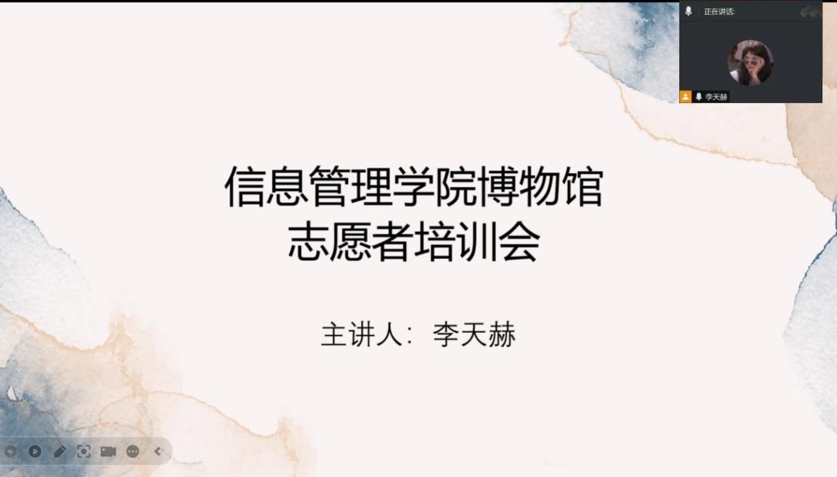 为提升“行走在龙江博物馆里的思政课”系列志愿宣讲活动服务效能,信息管理学院青年志愿者协会于2025年8月15日在线举办博物馆志愿服务活动培训会。会议由信息管理学院青年志愿者协会副主席李天赫主持。