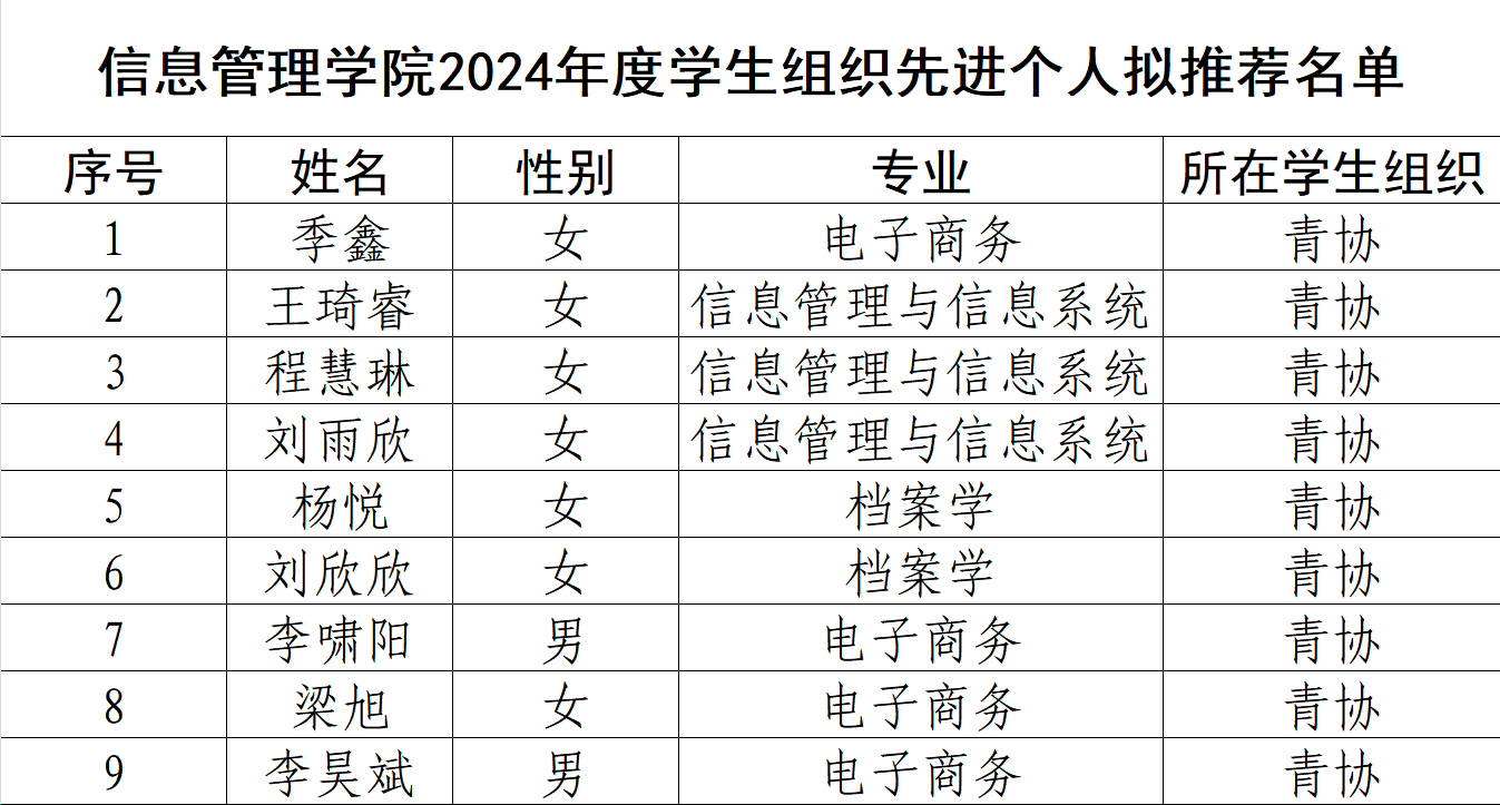 经个人申请、院团委办公会议评选,拟授予季鑫等9名学生“2024年度黑龙江大学信息管理学院优秀志愿者”称号。