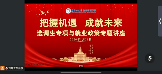2026年1月21日上午9时,信息管理学院召开2026年选调生政策解读答疑会暨2026届毕业生年级大会,会议特邀黑龙江大学招生就业指导中心就业指导部主任于航作为主讲嘉宾,党委副书记赵丽明,2026届毕业生辅导员耿强、刘越,2026届全体本硕毕业生参会,会议由耿强主持。