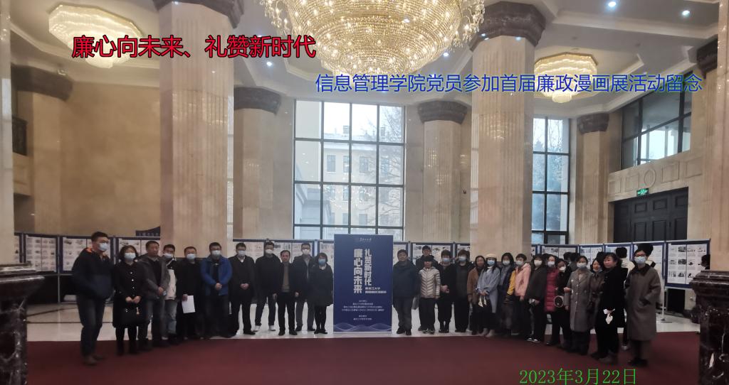 为全面贯彻习近平新时代中国特色社会主义思想和党的二十大精神,深入贯彻落实习近平总书记关于全面从严治党的重要论述,扎实开展学习贯彻习近平新时代中国特色社会主义思想主题教育,切实增强全院师生、党员干部廉洁从政、廉洁用权、廉洁从教、廉洁修身、廉洁齐家的政治自觉、思想自觉和行动自觉,筑牢反腐防线,信息管理学院党委组织学院领导班子成员和师生党员于3月22日参观了由校党委宣传部、省纪委监委驻黑龙江大学纪检监察组、中共黑龙江省委奋斗杂志社《党的生活》编辑部主办,艺术学院承办的“礼赞新时代,廉心向未来”黑龙江大学首届廉政漫画展,开展“加强新时代廉洁文化建设 营造良好廉政校园新风尚”情景研学活动,开展接受廉洁文化主题教育。
