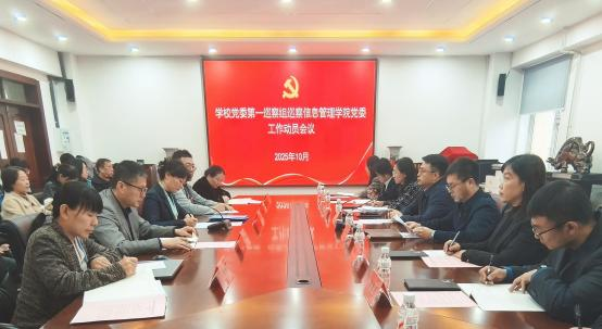 根据学校党委关于巡察工作的统一部署,2025年10月15日下午,学校党委第一巡察组巡察信息管理学院党委工作动员会在汇文楼834室召开。会前,学校党委第一巡察组组长、副校长崔本强与信息管理学院党委书记袁立莉、院长任越见面沟通,通报巡察任务和工作安排。会上,崔本强作动员讲话,对扎实开展巡察工作提出要求。党委常委、统战部部长、党委监督巡察办公室主任林强传达上级及学校党委关于巡察工作的重要指示精神。信息管理学院党委书记袁立莉主持会议。