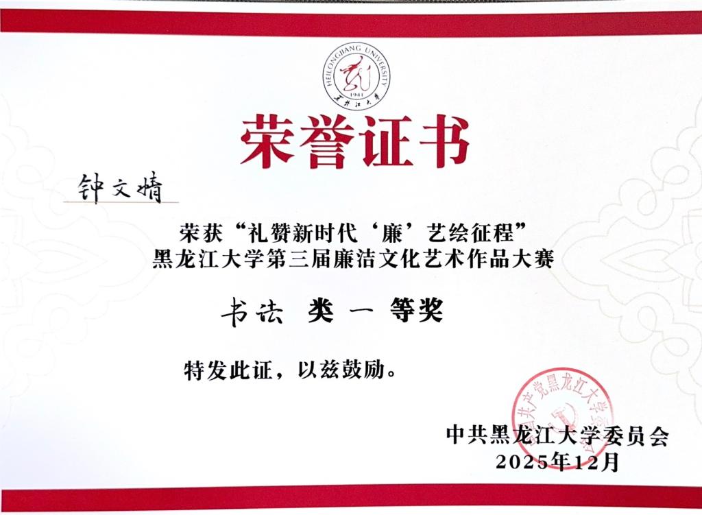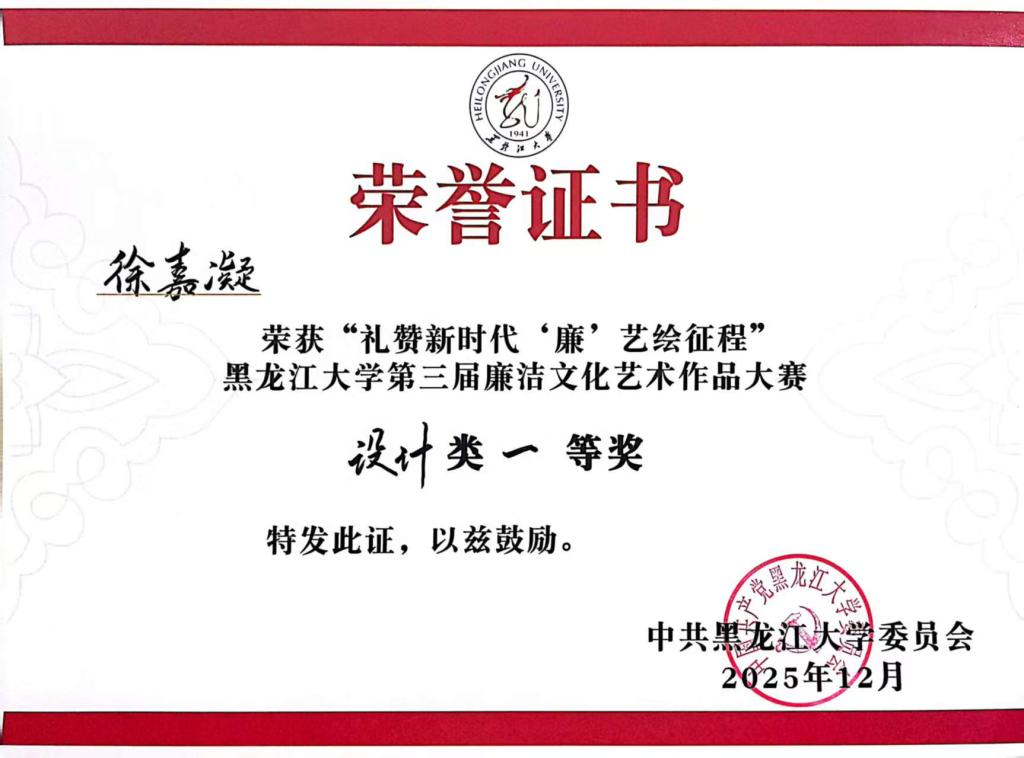 近日,黑龙江大学第三届廉洁文化艺术作品大赛评选结果揭晓。信息管理学院党委选送的作品在书法类与设计类评审中均获一等奖,集中展现了学院深入贯彻落实全面从严治党要求,扎实推进廉洁文化建设的育人成效。