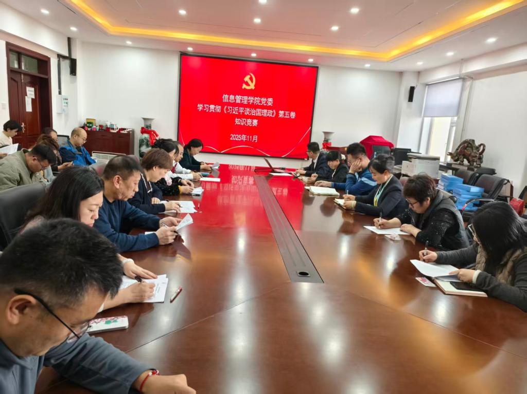 为深入学习贯彻习近平新时代中国特色社会主义思想,推动《习近平谈治国理政》第五卷学习走深走实,持续强化党员理论武装与党性修养,11月12日,信息管理学院党委在学院会议室组织开展了学习贯彻《习近平谈治国理政》第五卷党员知识竞赛。活动由学院党委书记袁立莉主持,全体教工党员积极参与。